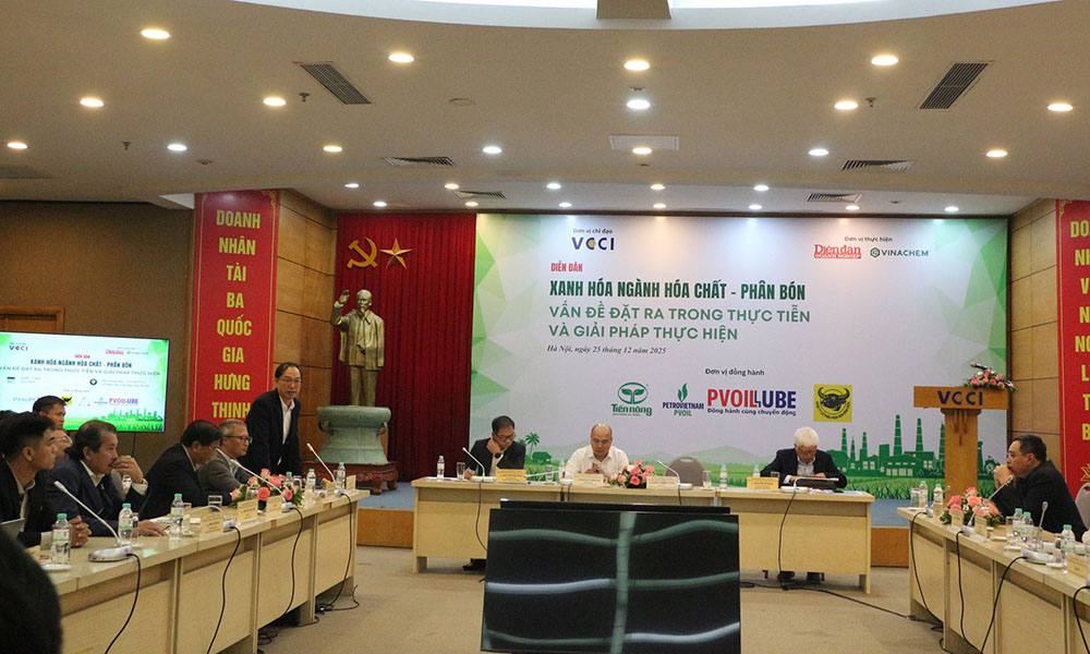 Chiều ngày 25/12/2025, Liên đoàn Thương mại và Công nghiệp Việt Nam (VCCI) chỉ đạo Tạp chí Diễn đàn Doanh nghiệp tổ chức Diễn đàn với chủ đề “Xanh hoá ngành hoá chất - phân bón: Vấn đề đặt ra trong thực tiễn và giải pháp thực hiện”. Diễn đàn có sự tham dự của đại diện Liên đoàn Thương mại và Công nghiệp Việt Nam (VCCI), Cục Hóa chất - Bộ Công Thương, Tập đoàn Hóa chất Việt Nam, cùng các chuyên gia, doanh nghiệp hoạt động trong lĩnh vực hóa chất và phân bón.